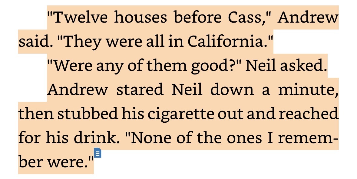 in trk on halloween, andrew says betsy is his 13th therapist, and shes the first therapist to get through to him. with him having gone through 12 houses before cass, that means cass was house 13, and she was the woman he most wanted as a mom. idk if its intentional (knowing nora, it probably is) but i think its really interesting that the number is the same for both betsy and cass, especially since hes closer with betsy than a normal therapist and patient should be. i know in the extra content, neil asks betsy to be at the trial because he thinks andrew needs a mother figure there, and while i personally hate the mother comparison, its interesting that shes compared to cass when theyre both number 13 in his life. not to mention if you add up his and neils jersey numbers you get 13 too. 13 seems to be significant to andrew
